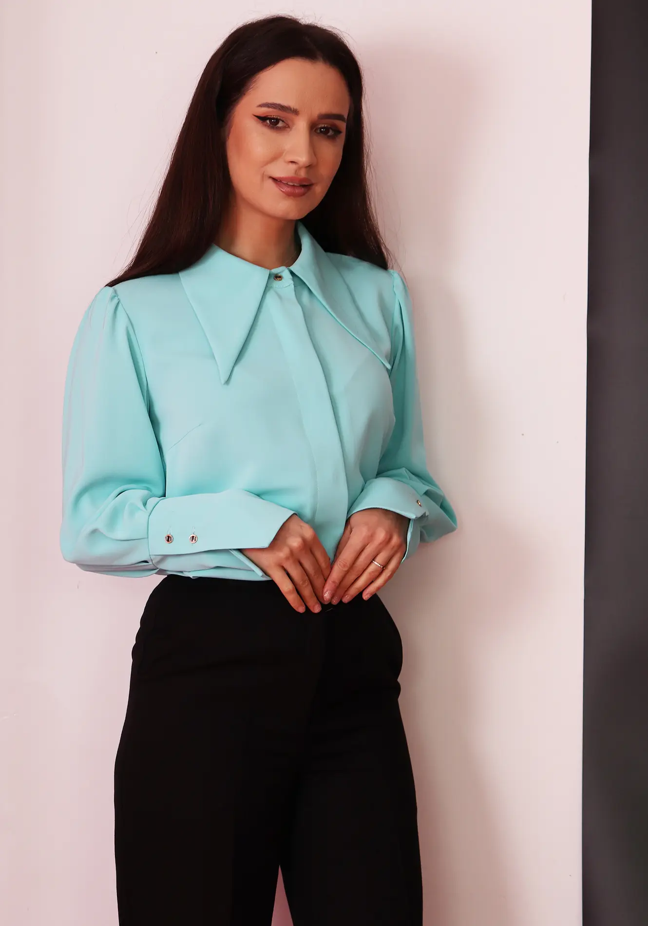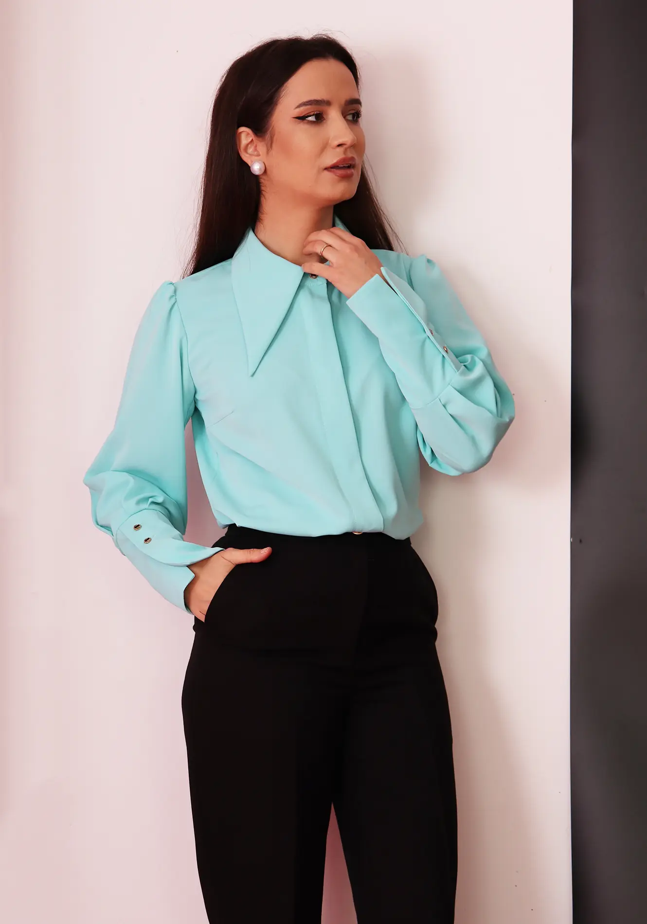 Cămașă elegantă damă, într-o nuanță rafinată de turcoaz/mint, ideală pentru ținute office sau smart-casual. Designul modern este evidențiat de gulerul supradimensionat, cu linii bine definite, care oferă un aer sofisticat și actual.