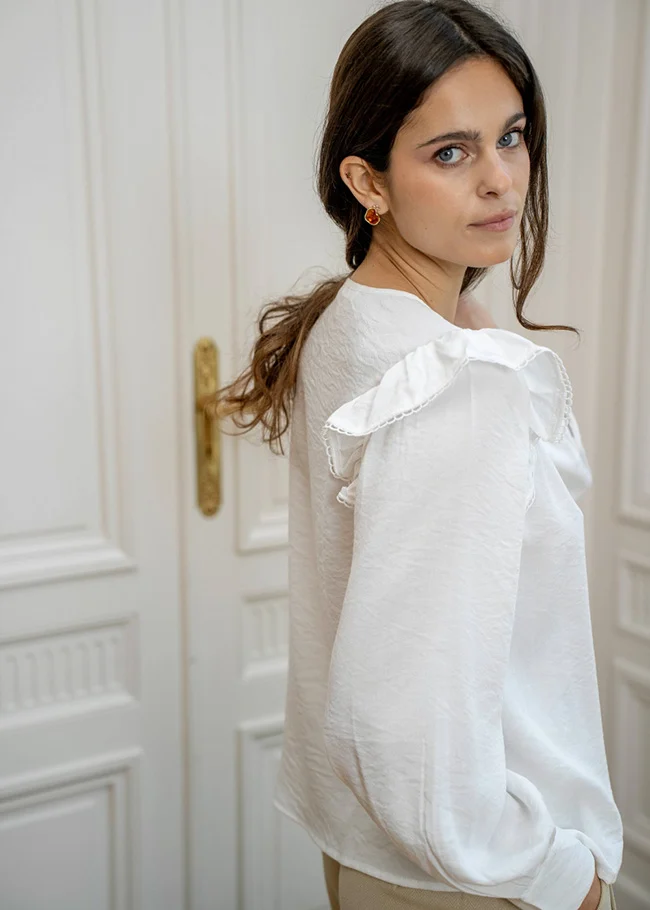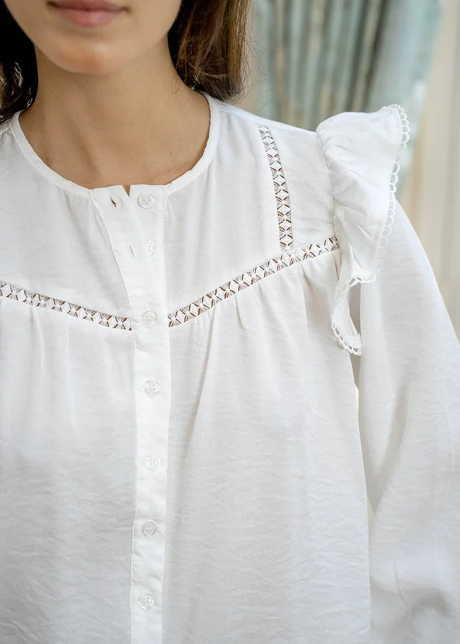 Adaugă un plus de rafinament garderobei tale cu această cămașă albă feminină, perfectă pentru ținute casual-chic sau office. Designul delicat este evidențiat de volănașele romantice de pe umeri și detaliile fine din zona pieptului, care oferă un aer sofisticat și modern.