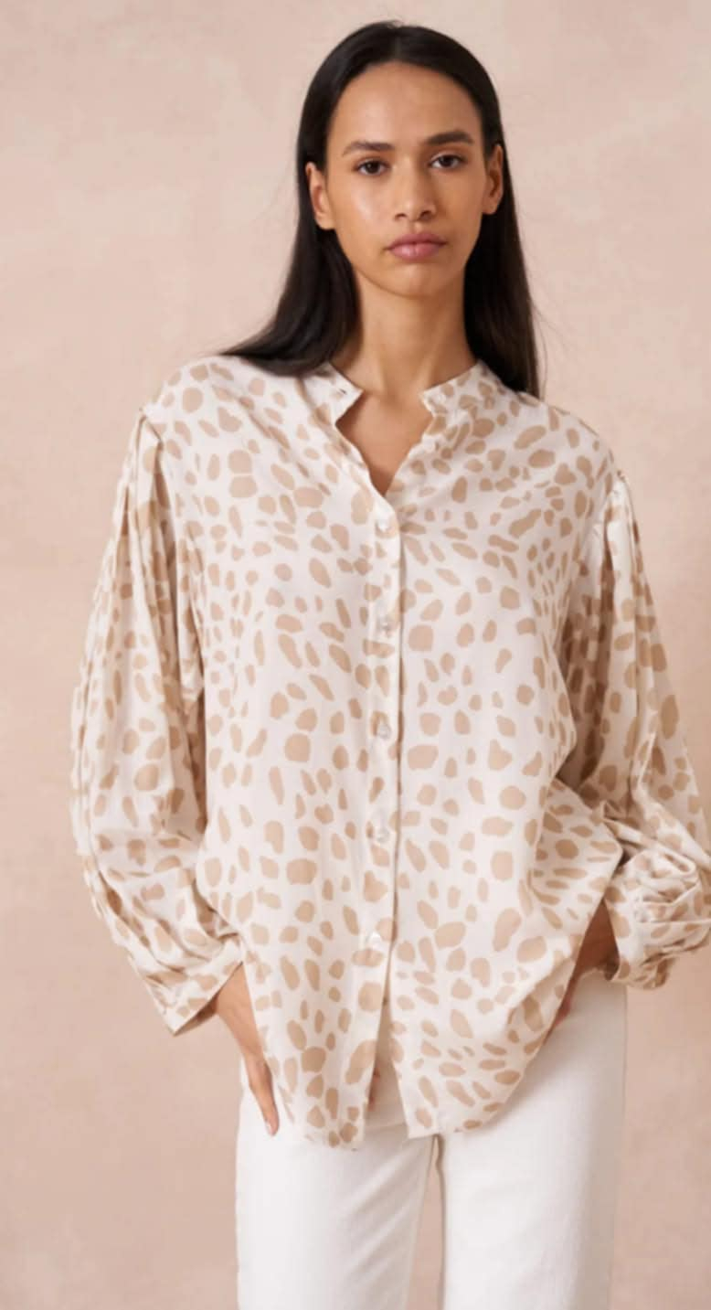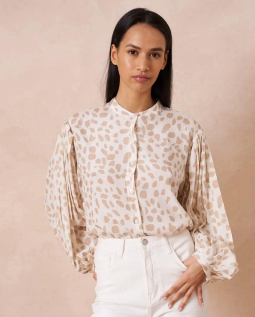 Camasa alba cu print bej este potrivita intr-o tinuta casual cat si intr- tinuta office. Este atent lucrata, manecile bufante si plisate o face diferita de camasile clasice. Se inchide cu nasturi iar gulerul este tip tunica, lungimea medie ii permite sa fie putatat atat in pantaloni cat si peste.