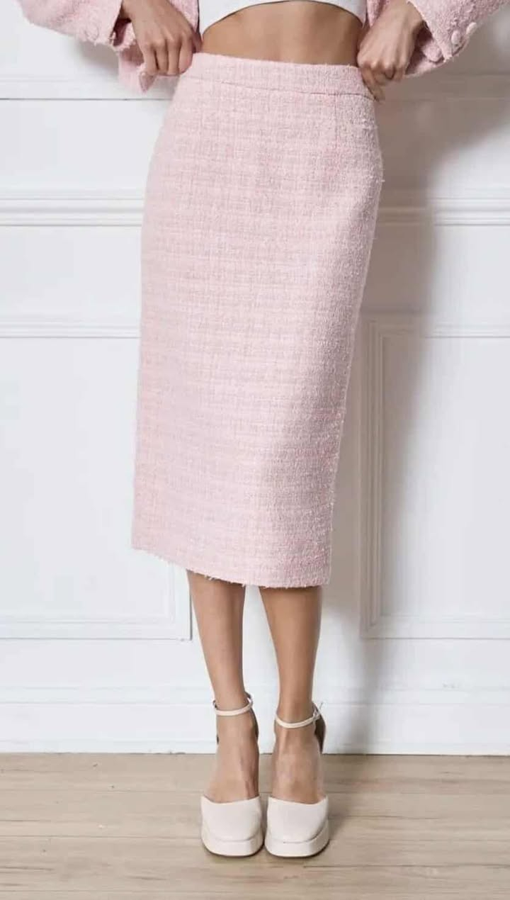 fusta eleganta cu croiala conica retro in stilul anilor 60 si crapatura la spate. O piesa feminina croita din tweed bleu pastelat captusala satinata,care se remarca prin design chic, Extrem de versatil, acest model se pliaza perfect pentru o tinuta office sau una moderna de zi. In functie de stilul personal o poti mixa fie cu accesorii colorate, in contrast, fie cu variante uni. Combina intotdeauna cu incaltaminte cu toc si genti in trend.