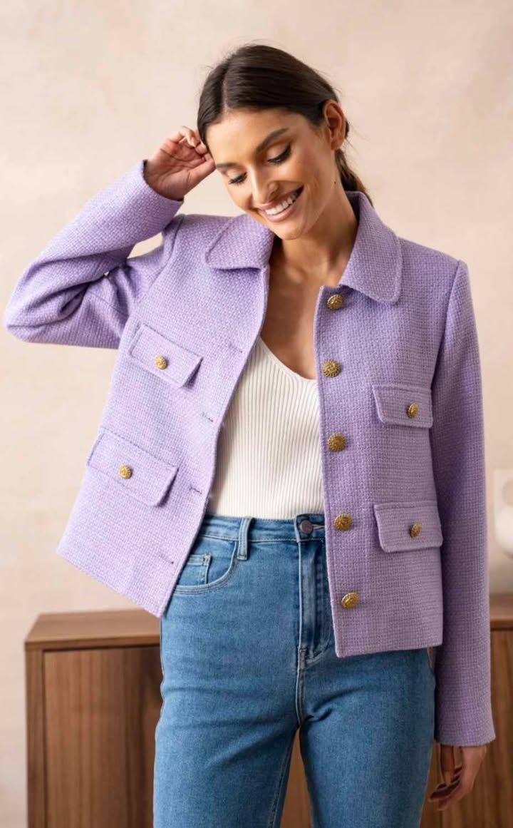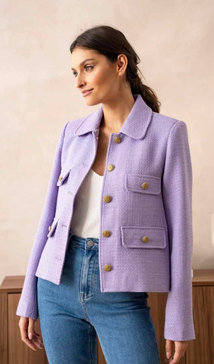 Sacoul din tweed cu nasturi și guler rotund poate fi purtat într-o varietate de situații, de la evenimente formale și la ținute de birou. Poate fi asortat cu fuste elegante, pantaloni uni sau chiar blugi pentru un aspect mai casual și eclectic.