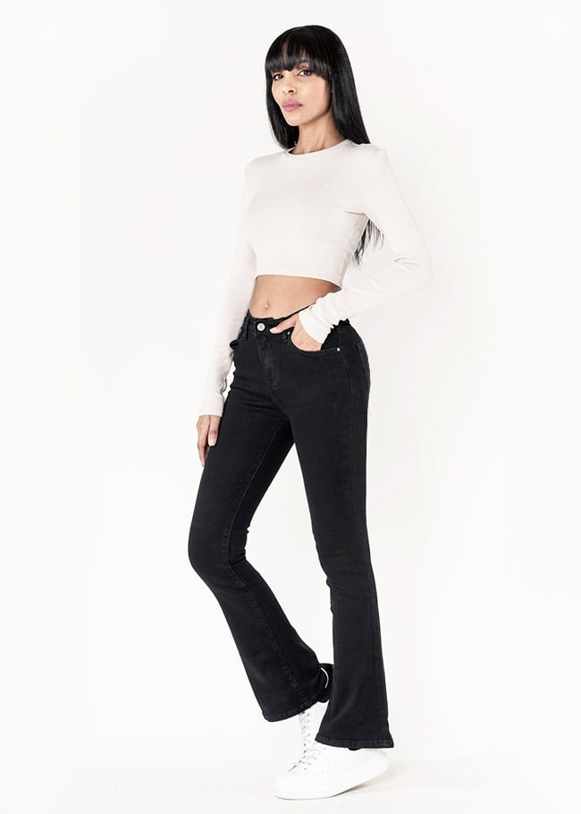 Tonul de negru adaugă o notă sofisticată, ușor de asortat, iar linia evazată alungește vizual picioarele, conferindu-ți o prezență elegantă fără efort.