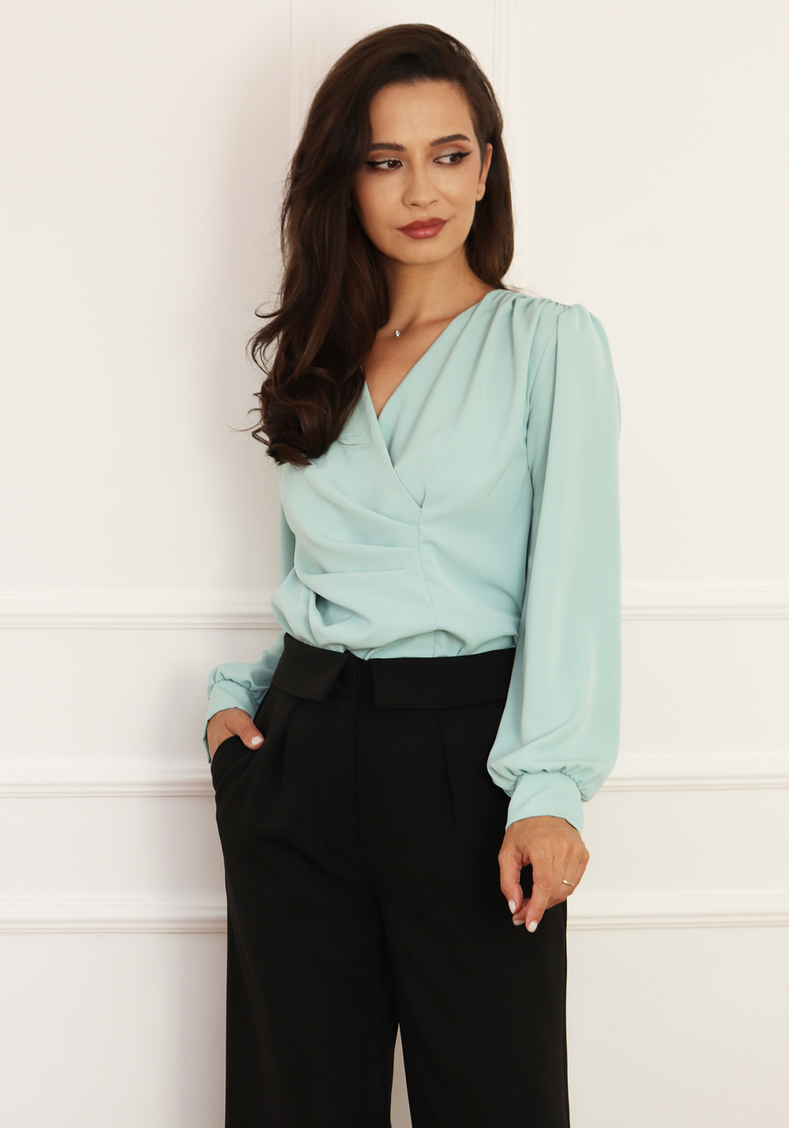Pantalon evazat cu peplum in talie si pliuri pe fata;