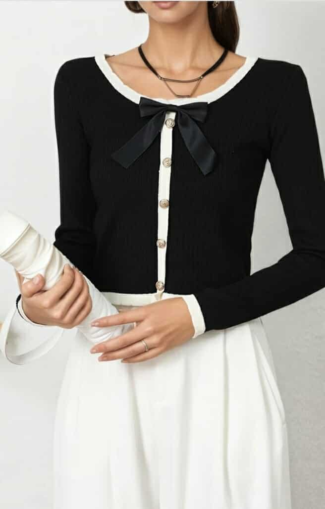 Designul negru, pus în evidență de detaliile albe de pe guler, manșete și tiv, creează un contrast elegant și atrăgător. Închiderea frontală este completată de nasturi aurii decorativi care adaugă un detaliu de lux. Funda decorativă aplicată la baza gulerului rotund subliniază feminitatea și delicatețea piesei.
