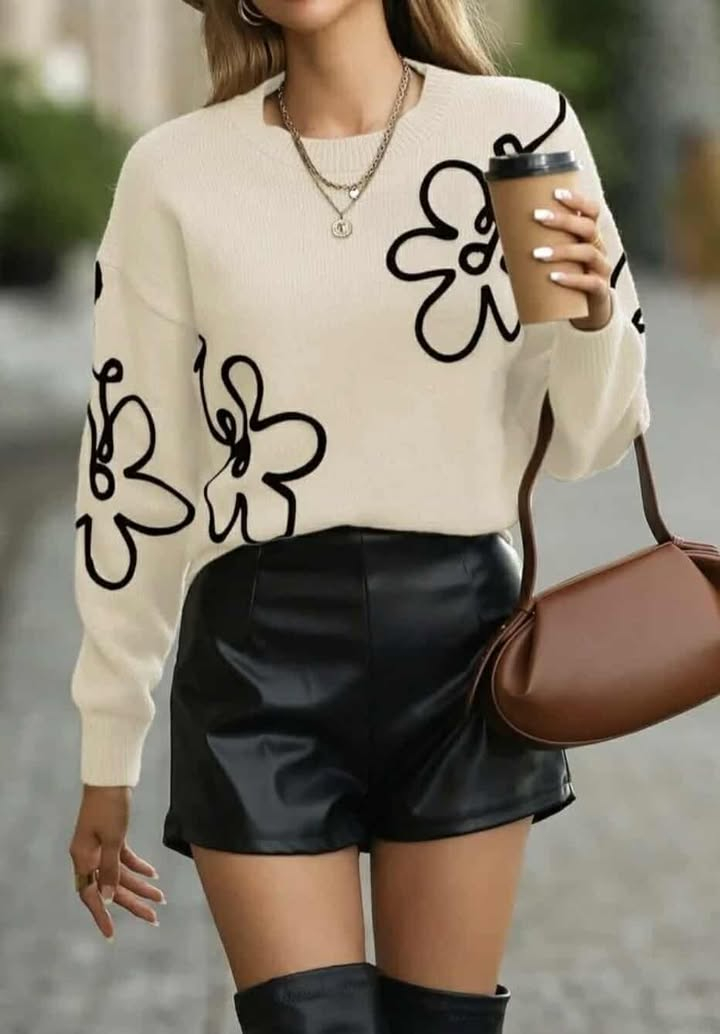 Adaugă un plus de stil ținutelor tale cu acest pulover modern, perfect pentru sezonul rece. Realizat dintr-un material moale și confortabil, oferă libertate de mișcare și o senzație plăcută la purtare. Designul cu flori negre conturate pe fundal crem aduce o notă feminină și trendy, ușor de asortat în orice outfit casual sau urban-chic.