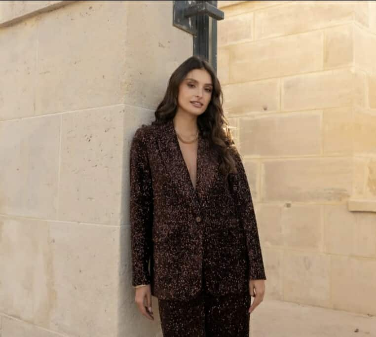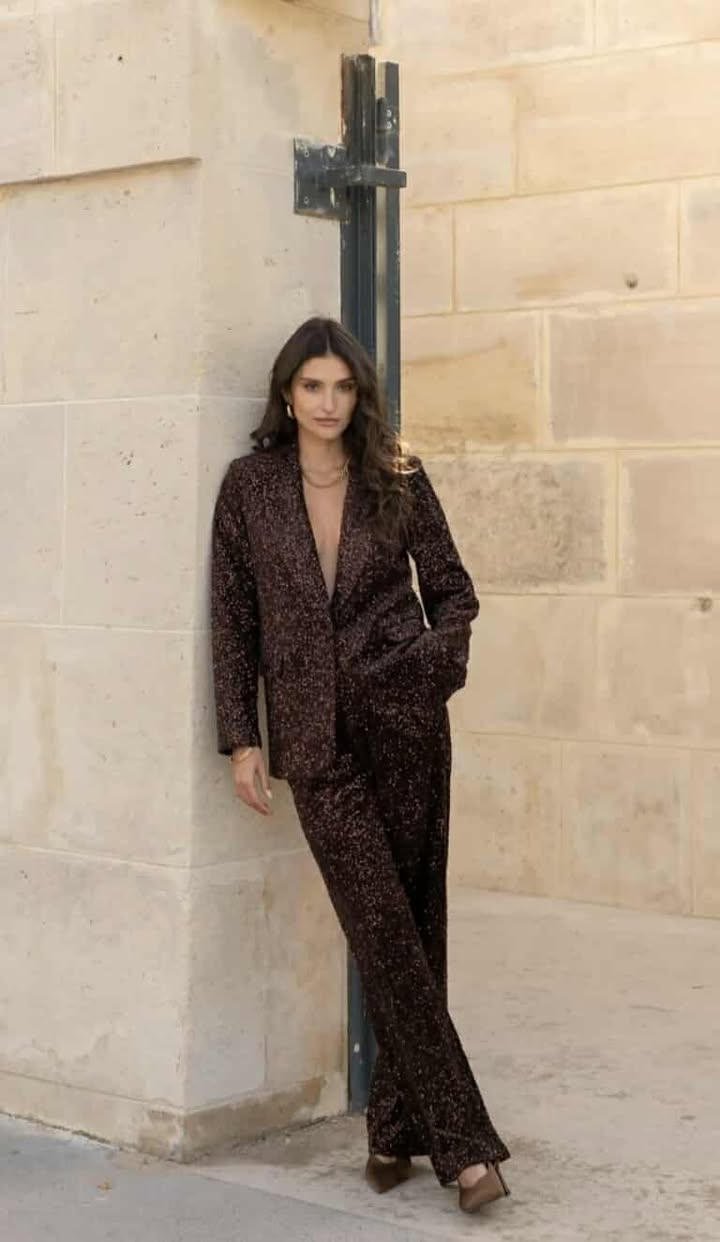 Adaugă o notă de rafinament și strălucire garderobei tale cu acest sacou spectaculos cu paiete bronz. Croiala sa modernă, ușor cambrată, evidențiază silueta, în timp ce textura luxuriantă cu reflexii fine conferă un aer sofisticat și îndrăzneț.
