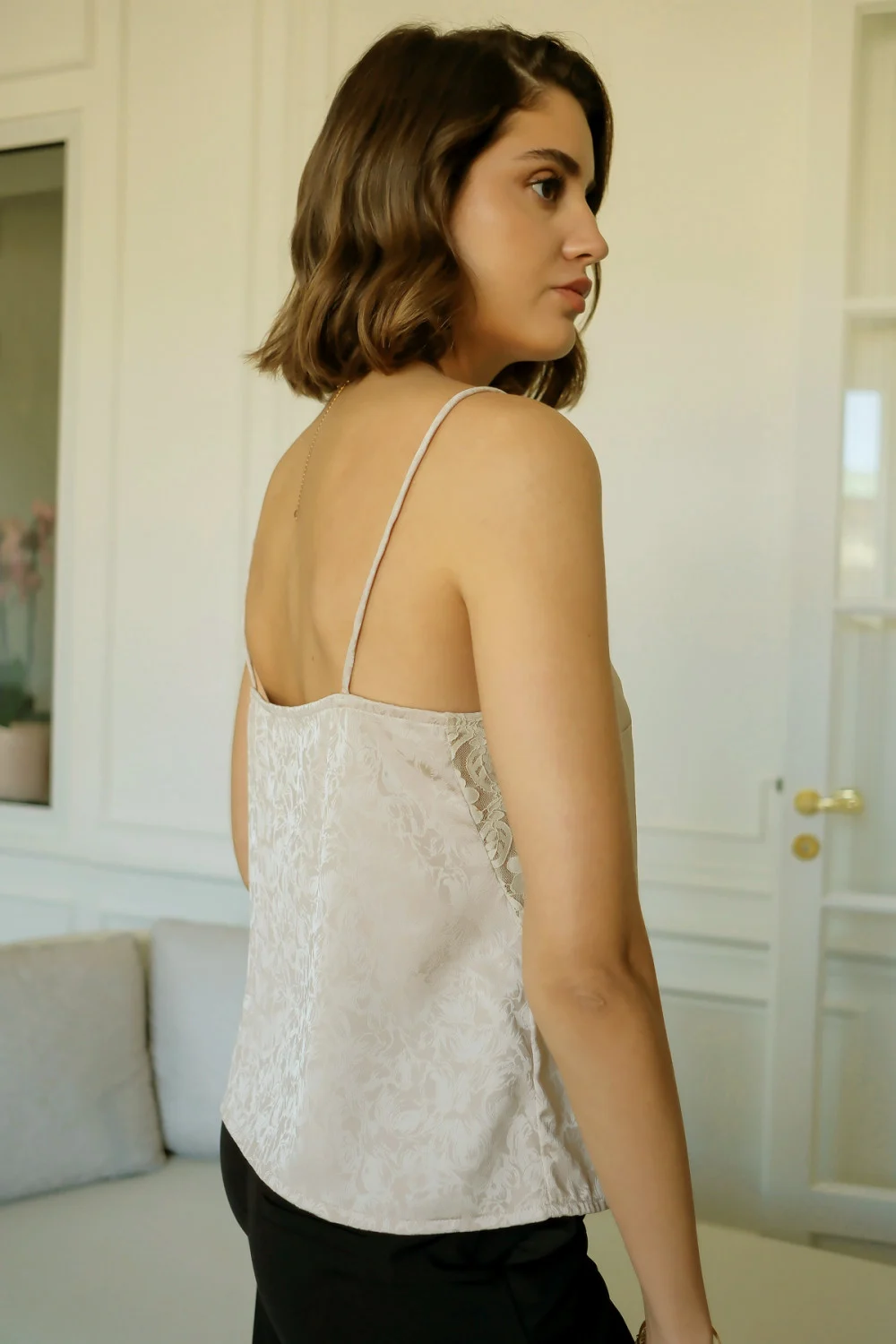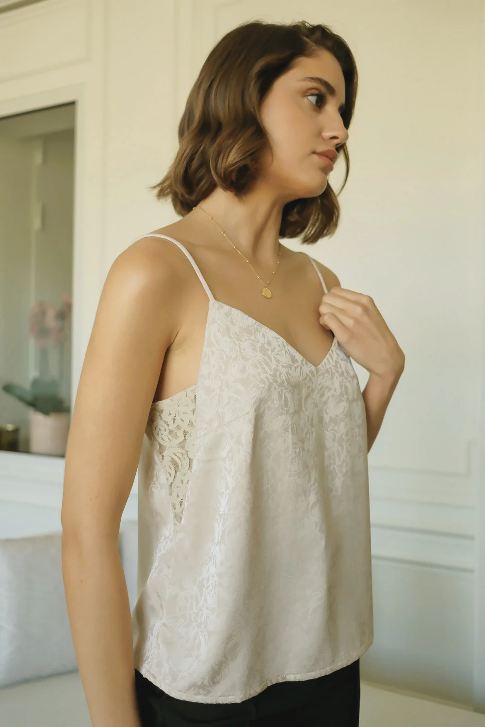 Top ivory cu imprimeu si insertii dantela