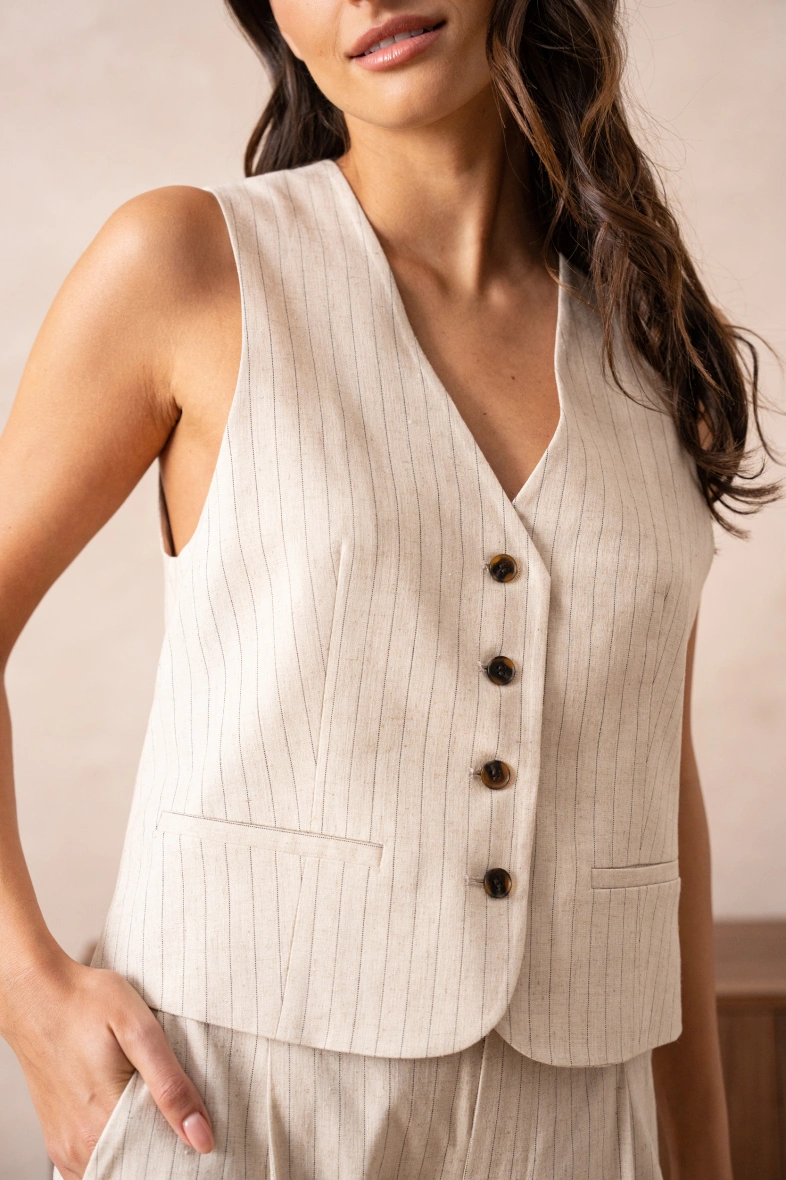 Această vestă elegantă, realizată dintr-un amestec de in, este piesa perfectă pentru un look sofisticat și rafinat în sezonul cald. Cu un croi cambrat și linii verticale discrete, vesta creează o siluetă alungită și feminină. Se încheie cu patru nasturi în nuanțe contrastante, oferind un accent chic. Are de asemenea două buzunare laterale decorative și o terminare rotunjită la bază, care adaugă un plus de delicatețe designului.